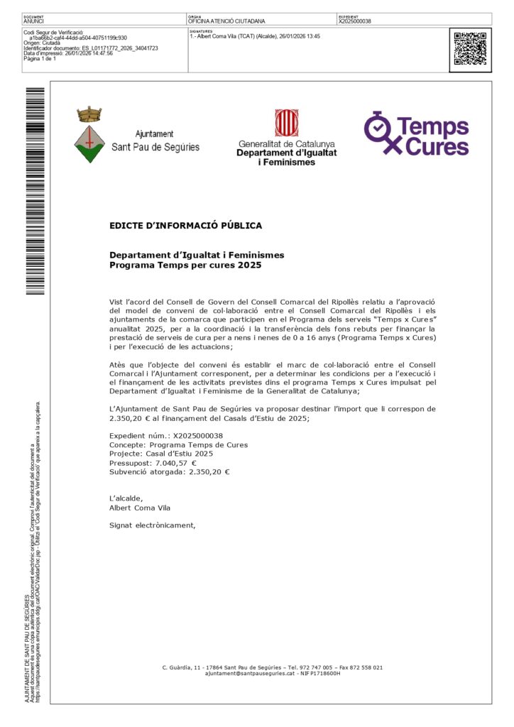 Notícies Edicte d’informació pública 26/01/2026 - 30/04/2026 Departament d’Igualtat i Feminismes Programa Temps de Cures < Entrada Anterior