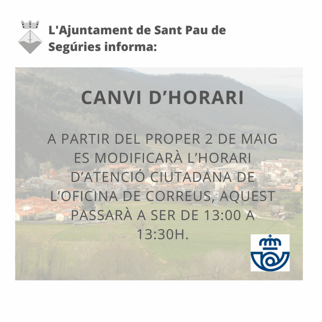Agenda Oficina de Correus, canvi d’horari 30/04/2025 - 17/08/2025 < Entrada AnteriorEntrada Posterior >