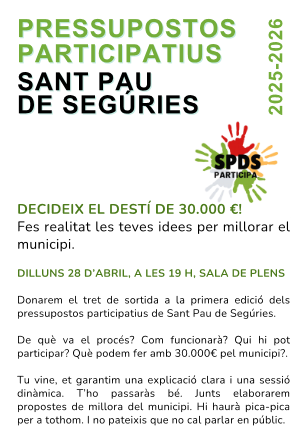 Agenda, Notícies Pressupostos participatius 23/04/2025 - 30/04/2025 | Sala de Plens de l'Ajuntament https://participa.santpauseguries.cat/pressupostos-participatius < Entrada AnteriorEntrada Posterior >