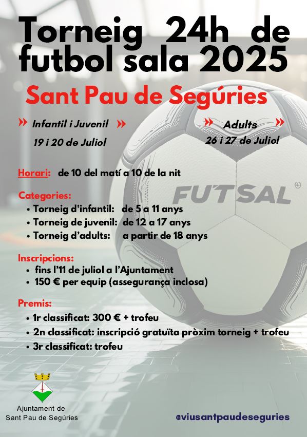Agenda Torneig 24 h de fultbol sala 2025 19/07/2025 - 27/07/2025 | Pavelló Municipal < Entrada AnteriorEntrada Posterior >